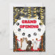 The perfect way to announce the grand opening of your new dog grooming / dog training / dog obedience business with this illustration featuring a circle of black dog paws framing a black and red template set against a white background. The paws are framed by vertical hanging faux gold streamers; string lights; black theatre curtains; a red carpet with upright poles connected by red cord and luxurious glitter sequins. Three dogs are sitting on the red carpet. A Cavalier King Charles Spaniel; a dachshund and a white poodle. Make sure your first impressions are lasting ones with this invitation that is sure to delight customers and guests.