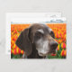 German shorthaired pointer in front of an orange tulip field