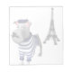Cute dog with a moustache wearing a blue and white striped shirt and a beret with the Eiffel Tower with the French flag in the background.