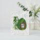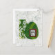Cute dog illustration with green floral shape, green oval and textured white background.