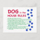 Dog in the house rules. A funny list of house rules your dog would write if he could. Rules to live by humour. Perfect gifts for any dog lover or dog owner. Dog Rules: 1. The dog is not allowed in the house. 2. Okay, the dog is allowed in the house, but only in certain rooms. 3. The dog is allowed in all rooms, but has to stay off the furniture. 4. The dog can get on the old furniture only. 5. Fine, the dog is allowed on all the furniture, but is not allowed to sleep with the humans on the bed. 6. Okay, the dog is allowed on the bed, but only by invitation. 7. The dog can sleep on the bed whenever he wants, but not under the covers. 8. The dog can sleep under the covers by invitation only. 9. The dog can sleep under the covers every night. 10. Humans must ask permission to sleep under the covers with the dog.