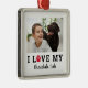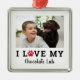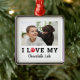 This modern holiday ornament for dog lovers features "I LOVE MY" wording in modern and bold black lettering with a red colored animal paw print accent. Personalize the black script with the type of pet or the pet's name Add a favorite horizontal photo. White background color.