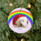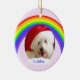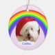 This pet dog memorial Christmas ornament features a rainbow right above your dog's head on a pink background. The design can be customised with the name of your dog below your dog's picture. A wonderful way to honour your special dog at Christmas. Copyright ornamentsbyhenis