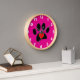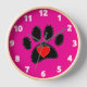 Cute black dog paw print and red heart drawings. Hot pink background version. Custom decorative wall clocks. All that's seen is printed. no actual stitching will be used in the making. Gift idea for women that love dogs.