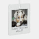 This simple and elegant square Christmas ornament is a sweet way to celebrate your puppy or pet’s first holiday season. The design features space for one photo on the front and one on the back, making it a double-sided keepsake filled with adorable memories. "My First Christmas" is displayed underneath the front photo in a classic serif font, with your pet’s name written below in soft script for a personal touch. If you’re celebrating more than one pet, you can easily change the wording to say "Our First Christmas" instead.