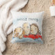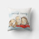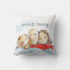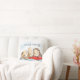 This throw pillow has an illustration of a cute puppy and its parents, a bald man and a brunette woman. You can customise the text.