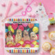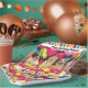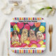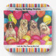 Dog party paper supplies. Four cute dogs sit wearing party hats and are surrounded by colourful balloons and a red, yellow, orange and blue striped border. Happy Birthday - Let's Get This Paw-ty Started - fun, birthday party decorations paper goods for a dog lover. Personalise with their name for a special touch.