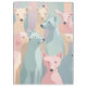 This image is a pastel-toned abstract illustration of a group of dogs in various shades of soft pink, blue, beige, and green. The composition features elegant, stylised depictions of canines, each with minimalistic yet expressive details. The background complements the figures with soft gradients and overlapping shapes, creating a dreamy and artistic atmosphere. The overall aesthetic conveys calmness, unity, and a modern, artistic vibe.