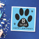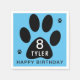 Dog Paw Blue Kids Birthday Party Napkins. The design features a Happy birthday text, a name in a black dog paw print on a blue background. Personalise the napkins with the kid`s name and age.