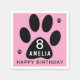 Dog Paw Pink Girl Kids Birthday Party Napkins. The design features a Happy birthday text, a name in a black dog paw print on a pink background. Personalise the napkins with the kid`s name and age.