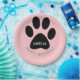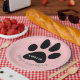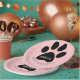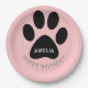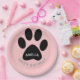 Dog Paw Print Pink Birthday Party Paper Plate. The design features a Happy birthday text, a name in a black dog paw print on a pink background. Personalise the plates with your name. You can change or erase the text Happy birthday.