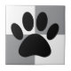 Cartoon dog paw print in black. Squares in white and grey in the background.