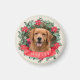 The charming design showcases your dog's photo framed by a lush holiday wreath with evergreen branches, red poinsettias, pine cones, and seasonal greenery. Your dog's name appears on an elegant red ribbon banner, creating a personalized touch that makes this magnet truly one-of-a-kind. The pet magnet has a professional, polished finish that looks beautiful as a Christmas fridge magnet.