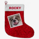 Easily add a cute, square photo of your pet dog (or cat) to this full-bleed photo stocking template with a red and white name border. The name's font, colour, and size can be changed. Choose the fabric and the size (small or large) of the stocking from the options menu before ordering