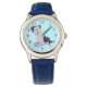 This cute little black and white border collie puppy is waving "hello" or is he just being a bit shy and hiding behind his paw? either way this little puppy dog looks very sweet with his little blue teddy bear laying by his paws. I think this sweet little waving collie puppy kids watch makes a great gift for any kiddy who loves cute border collies. This stylish watch has easy to read numbers in matching blue that look great on the neutral coloured watch face. The original puppy portrait painting of this baby collie dog and his teddy are painted in watercolour. If you're interested in commissioning a pet portrait for yourself or as a special gift for someone, please don't hesitate to email me for further details. I look forward to "chatting" to you:) Maybe you'll see your own beloved pet on a great zazzle product.