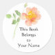 A stick-on bookplate with a peachy-colored dogrose, painted in watercolours, and the text, 'This book belongs to Your Name' for you to customize.