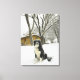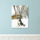 Dog sitting in snow with log cabin behind canvas print