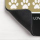 Dog theme mouse pad in brown, black, and white with cute dog paw prints and the words I Love Dogs across the mouse mat in text you easily personalise if you want to by replacing the text with your own name or message. Designed as a gift for dog lovers, veterinarians, or any dog rescue or cause.