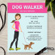 Spread the word about your dog walking business with the help of this Destei design featuring a cute woman with brown long hair. The woman is wearing a pink T-shirt, black leggings and green colour sneakers. She is holding a red dog leash as she walks a cute small brown dog. The top has a pink background colour behind the title area while the rest of the design has a very light blue background colour. Personalise the sample text areas with the details of your business.