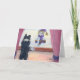 Dog watching snowman bearing gifts holiday card