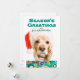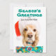 Dog wearing santa hat, holding present holiday card
