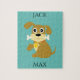 Playfull puppy with his bone and personalised name of child and puppy puzzle.
