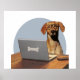 Sketch of dog wearing glasses, seated at desk in front of computer.