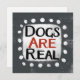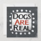 "Dogs Are Real" is a cute text design in grey with black and red text, along with a white accent shape and white textured whimsical dots surrounding it.