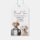 Whimsical illustration of a groom's dog in an elegant suit and a bride's dog with a pink bow