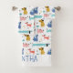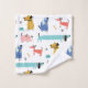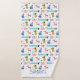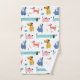 Cute collection of cartoon dogs in shades of pink, red, blue and golden yellow. Personalise the bath towel with your name or message in matching blue whimsical lettering.