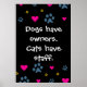This funny design with the quotation "Dogs Have Owners, Cats Have Staff" includes a pattern of coloured hearts and paw prints and makes a unique gift for dog and cat owners, pet owners and animal lovers.