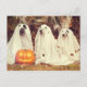 Funny Halloween Postcard - 3 cute dogs in ghost costumes, posing with a jack-o-lantern.