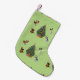 This Christmas stocking is decorated with puppies in Santa hata sitting around a Christmas tree.  Shown are a chihuahua, a papillon, a bloodhound and a Boston terrier.