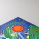 This vibrant artwork presents a captivating close-up of a dog's face, framed within the clear visor of an astronaut's helmet. Rendered with bold, textured strokes in a dynamic palette of oranges, blues, and reds, the canine's expressive gaze meets the viewer. The background unfolds into a stylized cosmic expanse, featuring distant planets and scattered nebulae-like formations, all rendered with a tactile, almost impasto effect. The intricate detailing of the fur and helmet contrasts with the energetic, abstract elements of the surrounding space, creating a striking visual narrative.