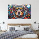This vibrant artwork presents a captivating close-up of a dog's face, framed within the clear visor of an astronaut's helmet. Rendered with bold, textured strokes in a dynamic palette of oranges, blues, and reds, the canine's expressive gaze meets the viewer. The background unfolds into a stylised cosmic expanse, featuring distant planets and scattered nebulae-like formations, all rendered with a tactile, almost impasto effect. The intricate detailing of the fur and helmet contrasts with the energetic, abstract elements of the surrounding space, creating a striking visual narrative.