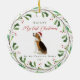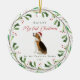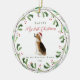 This sweet dog ornament features "my first Christmas in my forever home" typography with pretty red script. Your pet's name is prominent at the top of the design, and is surrounded by a festive botanical and berry painted wreath. The ornament includes a cute beagle illustrated dog in the centre. A beautiful gift for any fur parent!