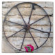 A vintage French cartwheel, mounted on a stone wall, meets a growing purple Hollyhock.