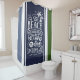 "the Beach where doing absolutely nothing is doing something" quote on navy blue background, modern / coastal style shower curtain, featuring steel blue, white and moss green stripes on the sides, designed by theLakeIsland.