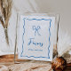 This beautiful Italian inspired bridal shower design features green handwritten style cursive lettering accented with a wavy scribble ribbon border in sunny blue. A hand drawn bow illustration completes the design for a summery Amalfi Coast look. This elegant Mediterranean bridal shower favours sign features handwritten lettering that can be customised if desired. Ready to frame; choose professional printing and shipping or the instant download option to print locally or at home.