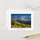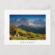 Postcard of the village St. Magdalena with its church in the Villnoesstal in South Tyrol, Italy, during autumn season with the Geisler Dolomites mountains in the background with a white border and the text: 'Dolomiti', Italian for 'Dolomites'.