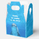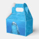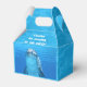 Dolphin party favour box with handle. Blue water with dolphin photography and a place to add your custom wording. Say “thank you” to party guests by filling this cute little box with goodies. Candy, stickers and small toys can be passed out to friends. Sample wording, in wavy white lettering, is “Thanks for coming to my party!” and is printed on the front top. The underwater dolphin face is printed on the front and back.