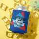 Pictured in a polyscope design is a dolphin dancing on the waves