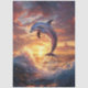 Colourful dolphin jumps through glowing ocean waves under a vivid sunset sky.