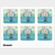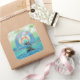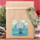 2 dolphins swimming in the ocean near a beautiful rising of colours and water with 2 planets, a moon and a colourful sun. Pink, blue, aqua, yellow and green colours in the water and sky.