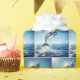 A dolphin joyfully leaps out of the water, wearing a colourful party hat, under a clear blue sky