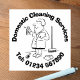 Fun domestic cleaning cartoon illustration shows a lady with cleaning equipment. Personalize it with your choice of business name and contact number. Ideal rubber stamp for a domestic cleaning company or domestic cleaning business.