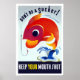 This vintage WW2 poster features a colourful fish, jumping from a pond, about to bite a fisherman’s hook. It reads, "Don’t Be A Sucker! Keep Your Mouth Shut". Celebrate World War Two History with this digitally restored vintage propaganda poster from The War Is Hell Store.