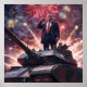 Share your love of President Donald Trump in 2024 with this Super Hero style poster featuring Donald Trump in a patriotic and heroic pose, standing atop a military tank with fireworks and sparks flying in the background.