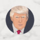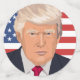 A head and shoulders vector graphic of President Donald Trump set against a red, blue and flag of of America background respectively.