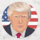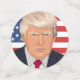 A head and shoulders vector graphic of President Donald Trump set against the flag of the United States of America